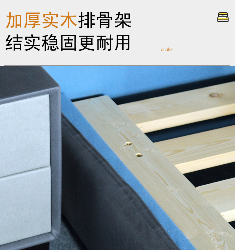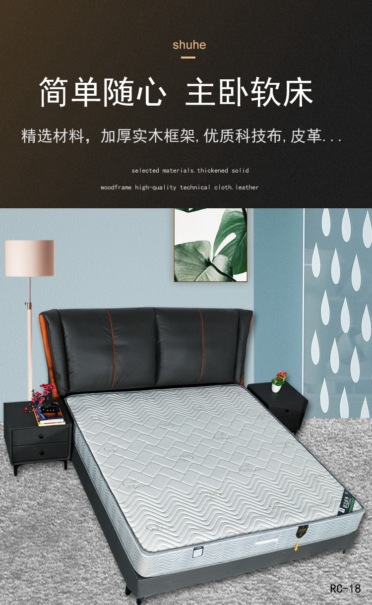 舒合RC-18家用主卧科技布软体双人床,采用松木实木框架,加厚松木排骨架,外包高弹绵等舒适层,优质科技布面料,柔软,韧性好,依靠更舒适...
