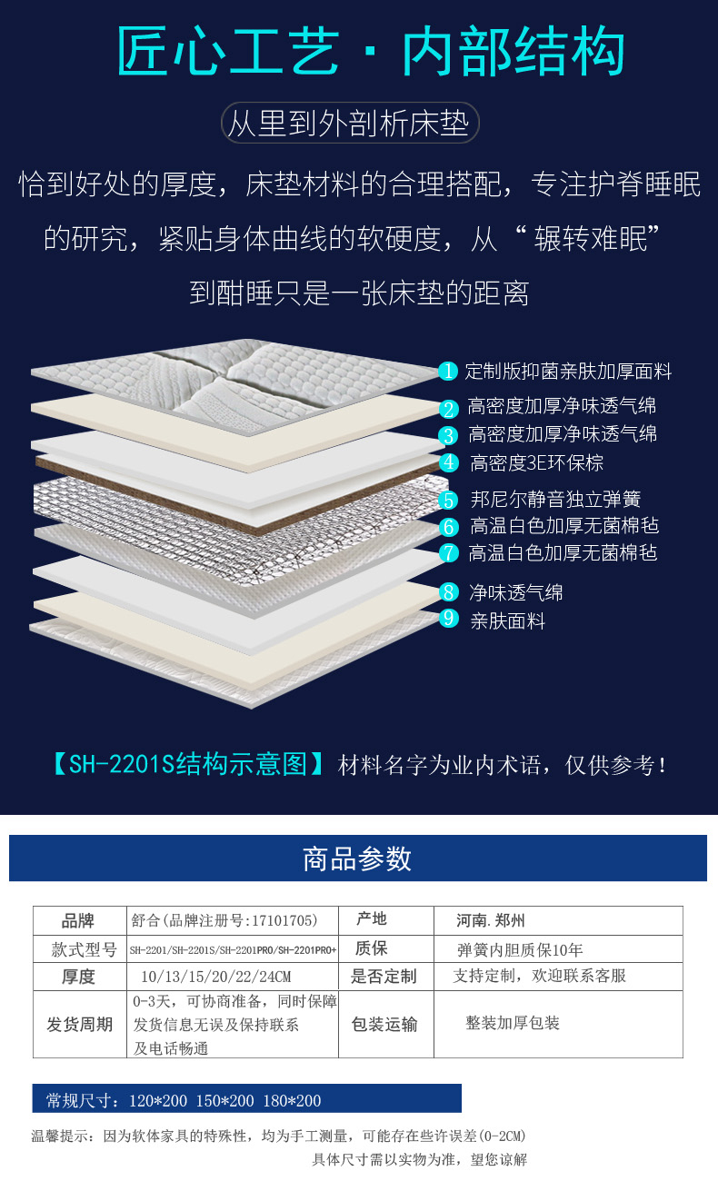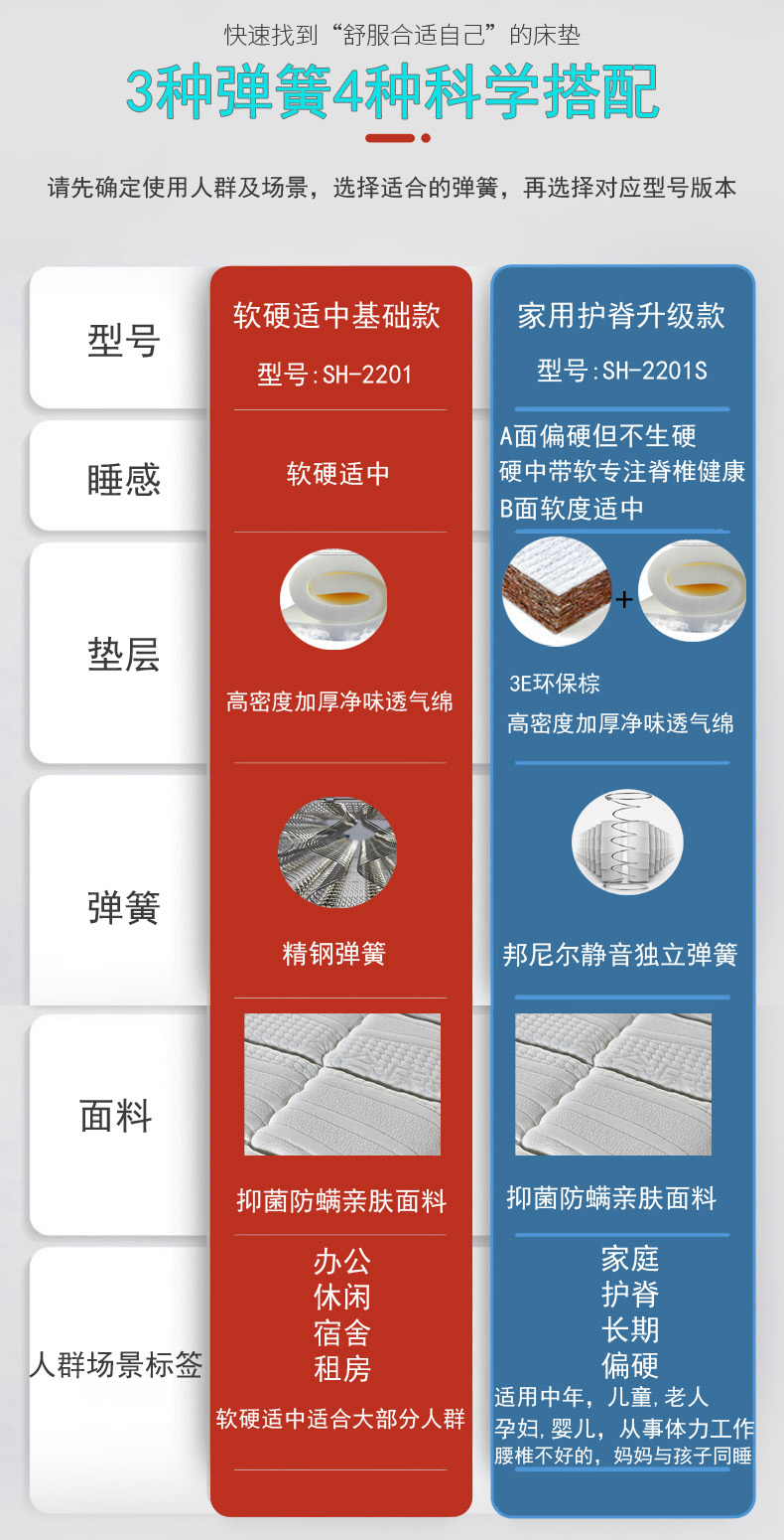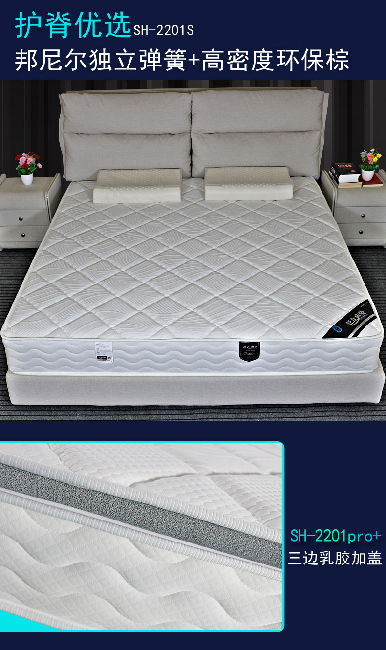 2,SH-2201S采用邦尼尔独立弹簧+高密度环保棕,专注健康护脊的床垫。