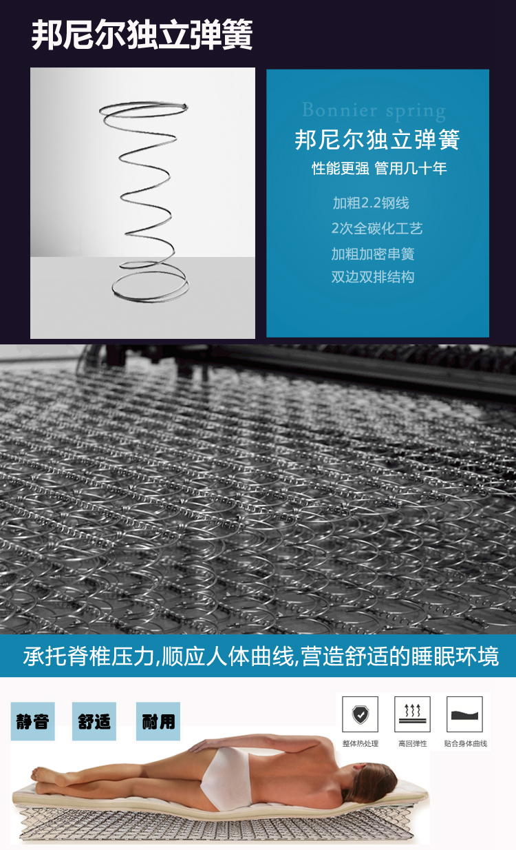 邦尼尔独立弹簧/九区布袋装弹簧床垫可选,棉提花亲肤面料,一面舒软一面硬朗的弹簧席梦思环保床垫。